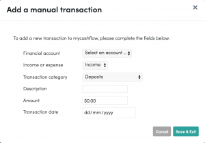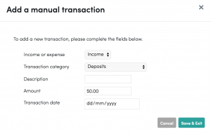 4. You will see an “Add transaction” button, click on that and you will be prompted to enter details for your manual transaction.